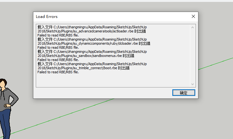 载入文件 C:/Users/zhangmingru/AppData/Roaming/SketchUp/SketchUp 2018/SketchUp/Plugins/su_trimble_connect/boot.rbe 时出错