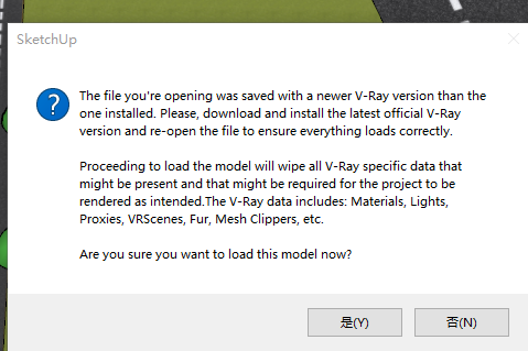 这个意思是你打开了一个新版vray创建的文件,你可以下载新版VRay并安装,以兼容这个文件或者抹去新版VRay创建的不兼容的vray资产,你是否愿意抹去所有vray资产(材质,代理,灯光,毛发等等啦)。